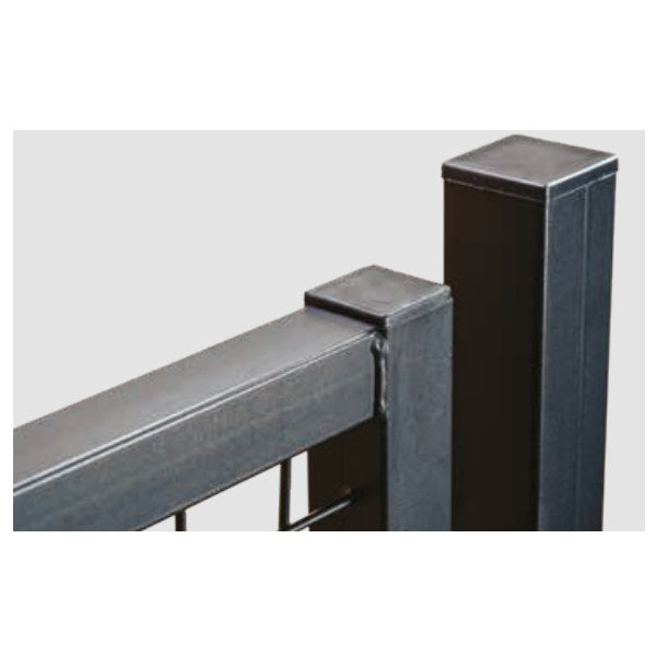 • Con telaio perimetrale e pali di sostegno, entrambi in tubo quadro d’acciaio, con specchiature in rete metallica elettrosaldata e componenti dei sistemi di chiusura in acciaio.