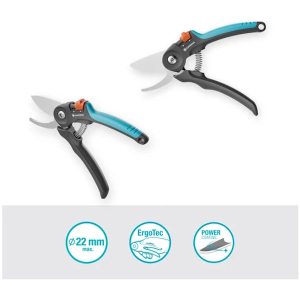 • Le cesoie PremiumCut Bypass GARDENA offrono un taglio potente e preciso: le lame con affilatura di precisione tagliano agevolmente rami freschi fino a 22 mm. di diametro e sono dotate del PowerCoating GARDENA; questo rivestimento assicura un taglio pulito che salvaguarda la salute delle piante, una facile pulizia e una protezione duratura per le lame.