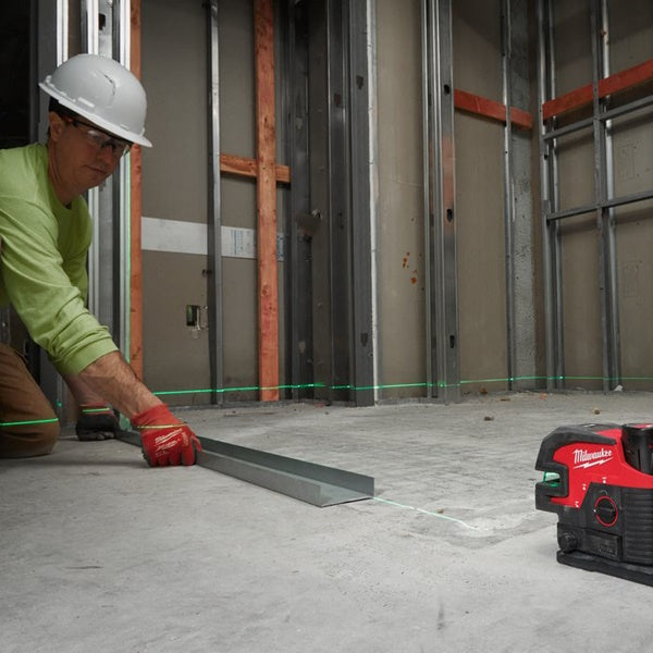 • Laser verde M12™ a due linee con 4 punti piombo, permette livellamento orizzontale, allineamento verticale, trasferimento di punti dal pavimento al soffitto e trasferimento di punti orizzontale.