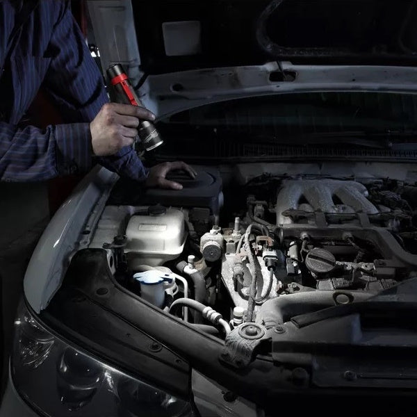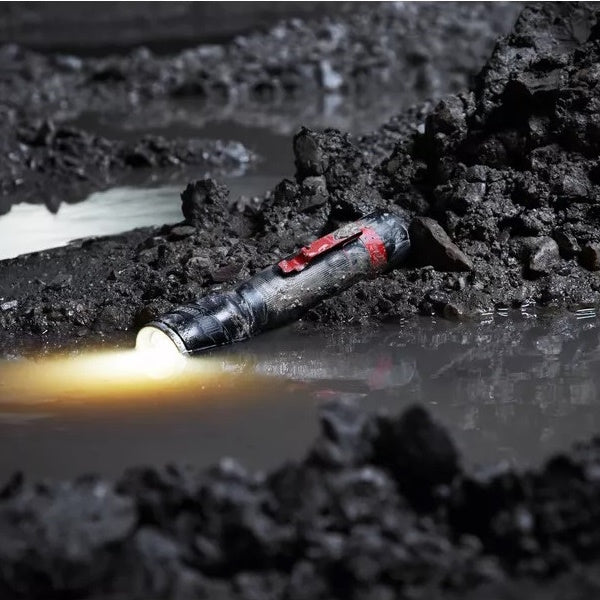 • Corpo in alluminio resistente all'uso intensivo, con impugnatura zigrinata e lente in policarbonato, resistente a cadute da 4 mt. di altezza.