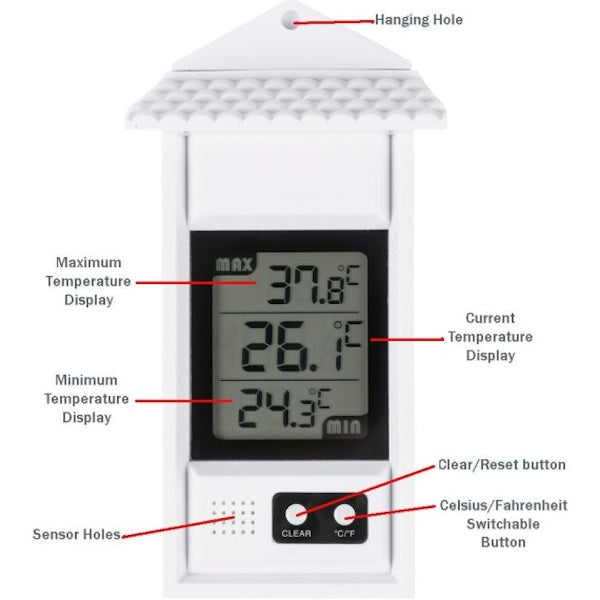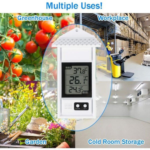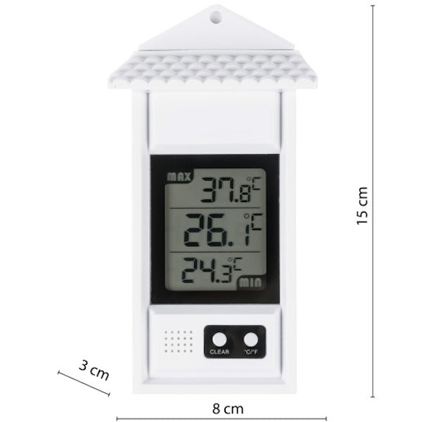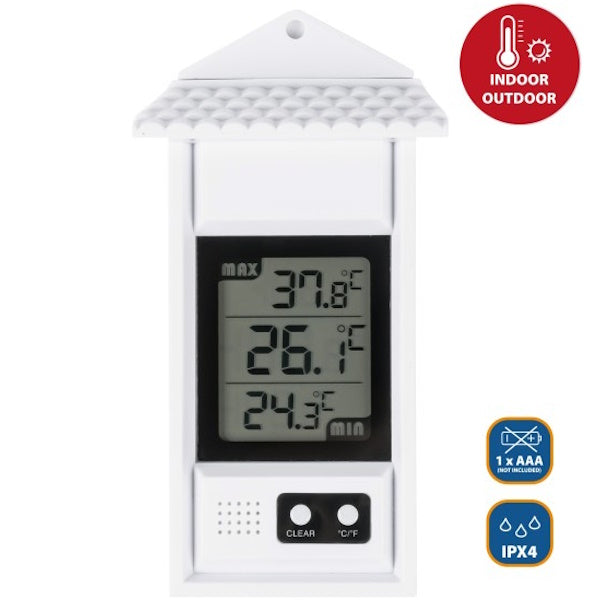 • Termometro digitale resistente agli agenti atmosferici, indicato per l'uso all'aperto.
